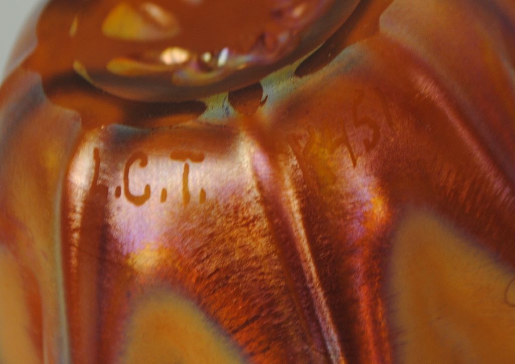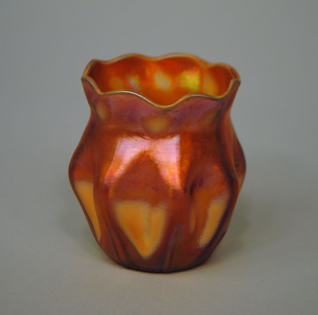 c1899 Louis Comfort Tiffany "Favrile" art glass 3"h cabinet vase, handblown with pinched ribs and shimmery iridescence, marked "L.C.T. k451". c1899 Louis Comfort Tiffany "Favrile" art glass 3"h cabinet vase, handblown with pinched ribs and shimmery iridescence, marked "L.C.T. k451".