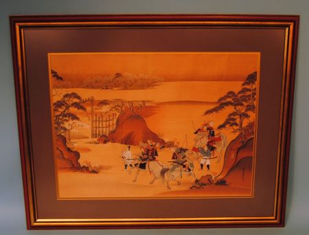 A large Japanese watercolor of Samurai on horseback, image size 23 1/2" x 16 3/4", 26" x 32 1/2" professionally framed. A large Japanese watercolor of Samurai on horseback, image size 23 1/2" x 16 3/4", 26" x 32 1/2" professionally framed.