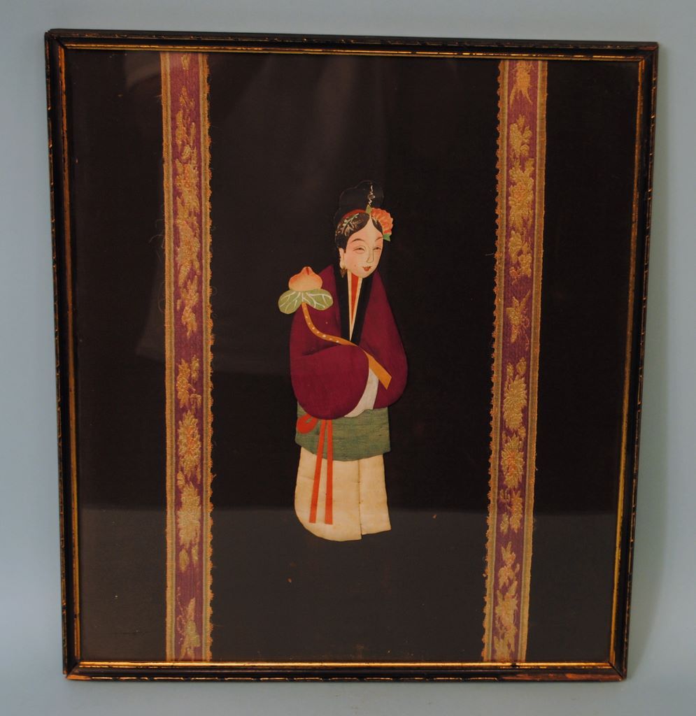 A framed Chinese applique figure of woman on black silk with rare vertical silk bands, 18" x 16"w framed. A framed Chinese applique figure of woman on black silk with rare vertical silk bands, 18" x 16"w framed.