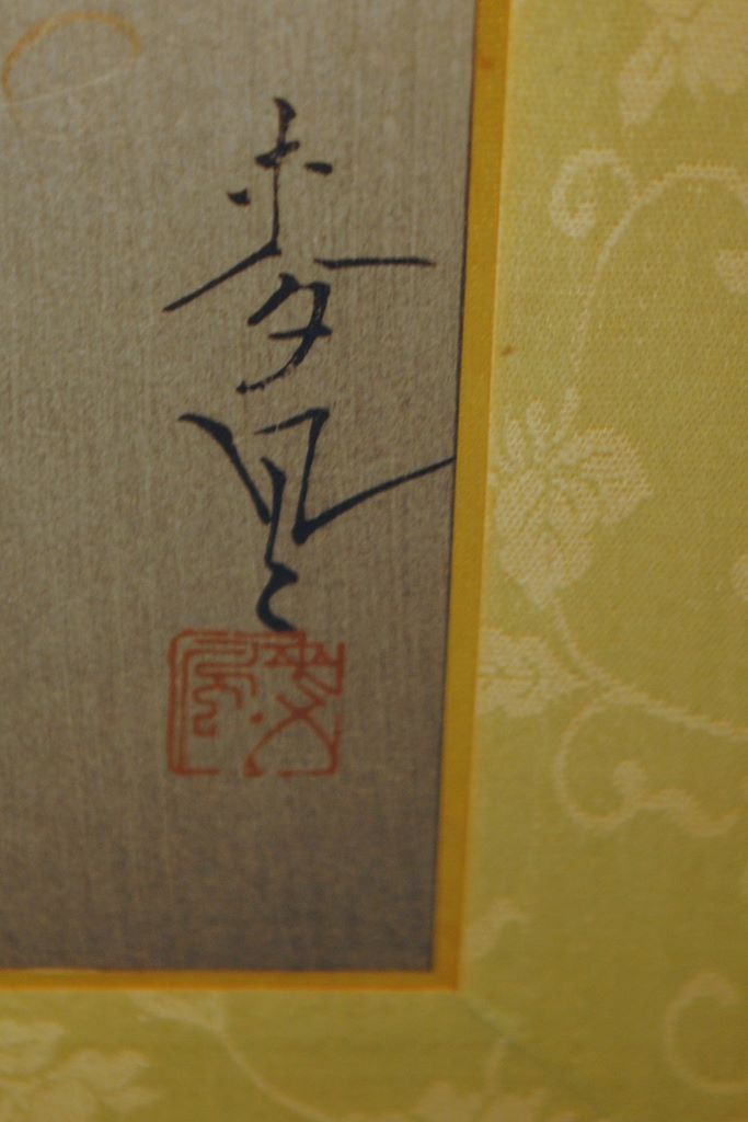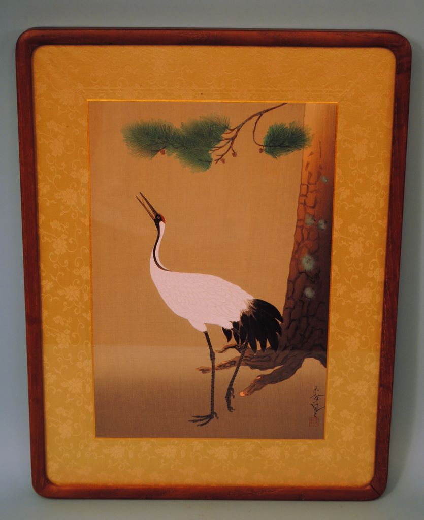 A finely worked 1930 Chinese painting on silk of a crane standing next to a pine tree, image size 14 3/4" x 10 1/8", professionally framed with silk brocade matte, 20 1/2" x. 16". A finely worked 1930 Chinese painting on silk of a crane standing next to a pine tree, image size 14 3/4" x 10 1/8", professionally framed with silk brocade matte, 20 1/2" x. 16".
