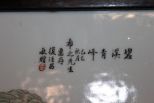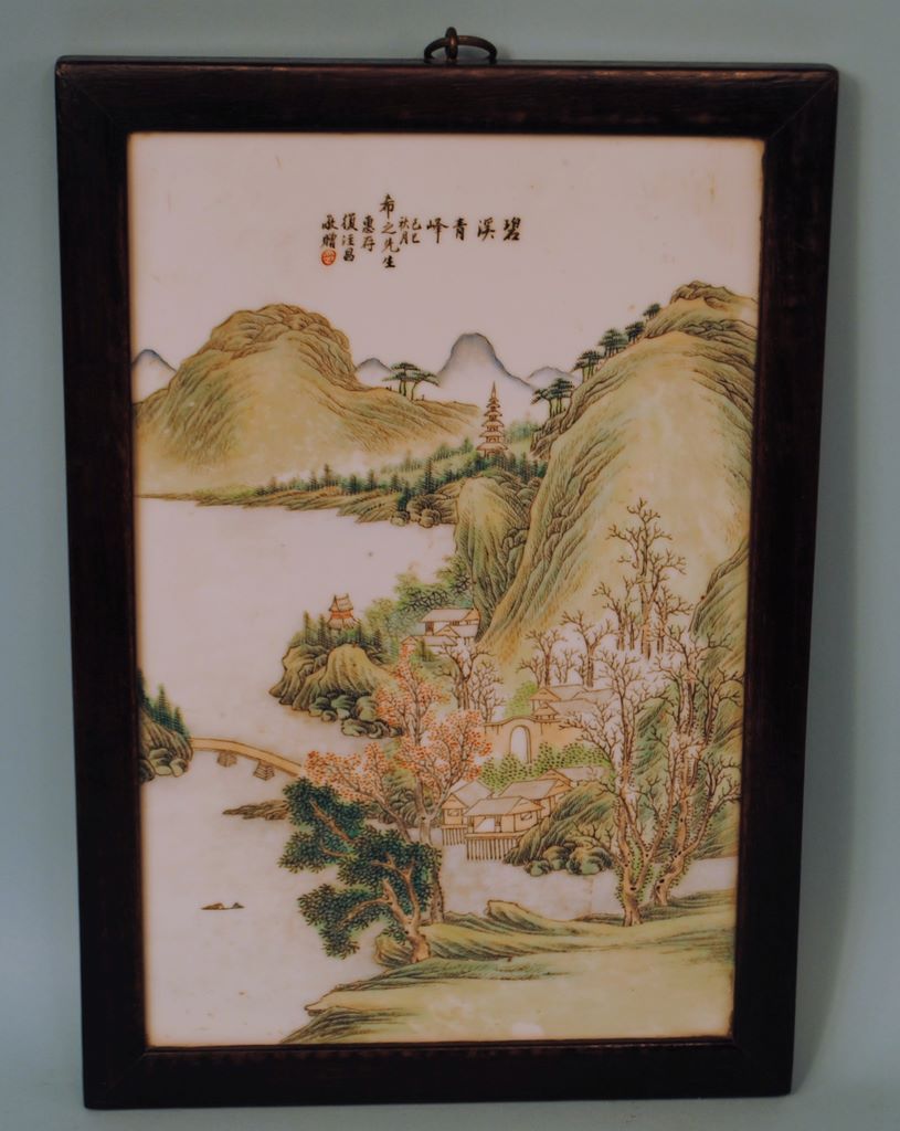 Chinese Porcelain Tile Painting showing Yangtze River, mountainous landscape with villages, Rosewood molding 16 1/2" x 11 1/2". Chinese Porcelain Tile Painting showing Yangtze River, mountainous landscape with villages, Rosewood molding 16 1/2" x 11 1/2".