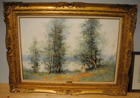 Marion Rice (1910-1995), American, an impressionist oil on canvas of two girls picking flowers in a serene garden by the sea, signed lower right. Canvas 36"w x 24 1/4", in gold-leafed carved gesso frame, 45 1/2" x 34". Marion Rice (1910-1995), American, an impressionist oil on canvas of two girls picking flowers in a serene garden by the sea, signed lower right. Canvas 36"w x 24 1/4", in gold-leafed carved gesso frame, 45 1/2" x 34".
