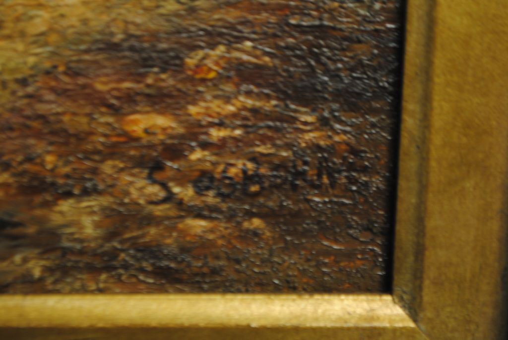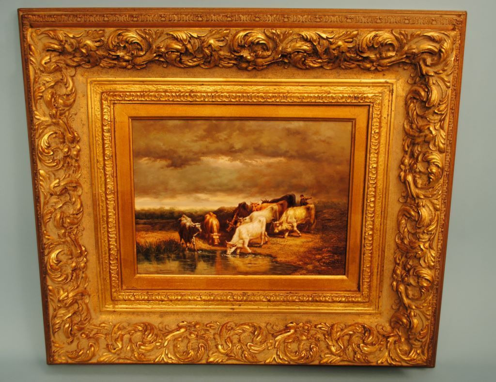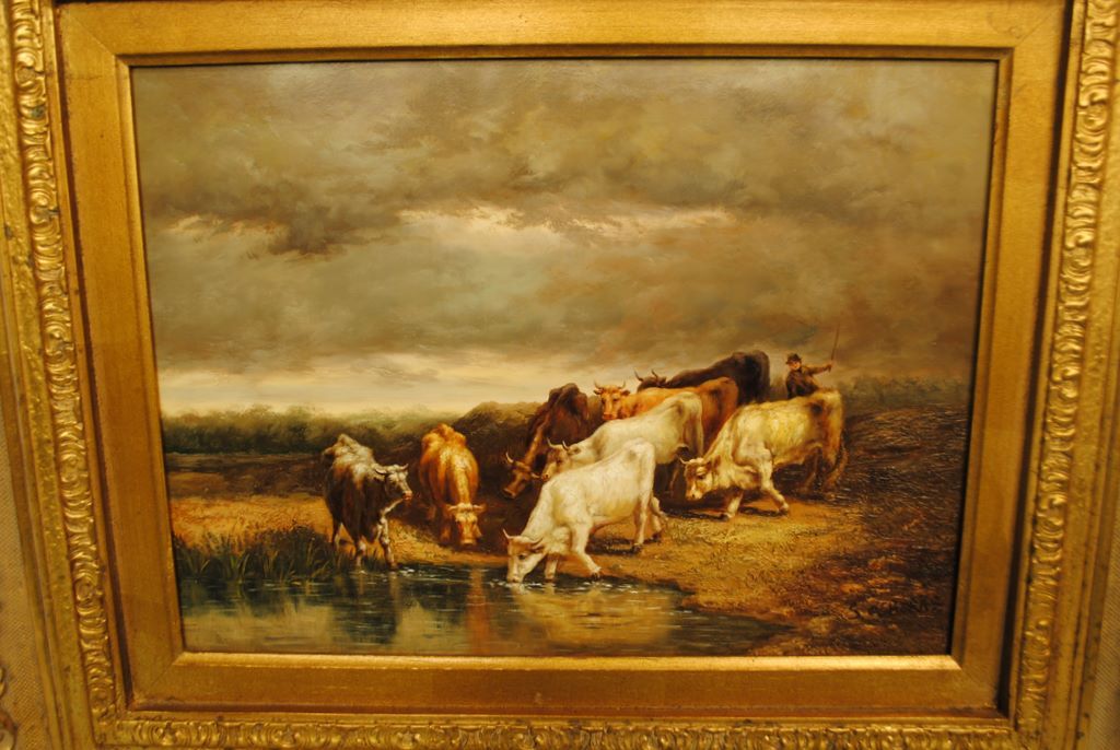 S. Osborne, American, "Cows in Bucolic Scene", 15 1/2"w x 11 3/4" oil on panel, signed lower right, 30"w x 26" in fine gold-leafed frame. S. Osborne, American, "Cows in Bucolic Scene", 15 1/2"w x 11 3/4" oil on panel, signed lower right, 30"w x 26" in fine gold-leafed frame.