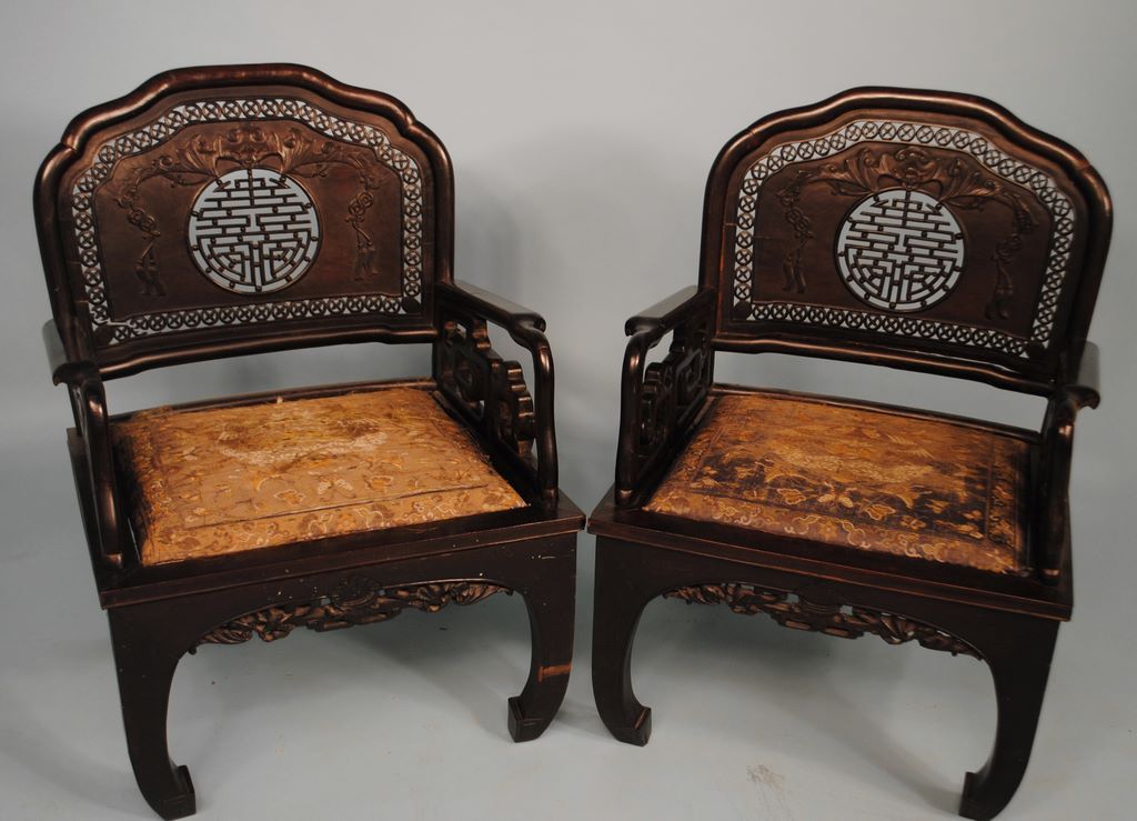 Pair of Chinese Mandarin Teak Chairs With Pierced Backs, late 19th century. 33 1/2" h., 25" w., 24" d. Pair of Chinese Mandarin Teak Chairs With Pierced Backs, late 19th century. 33 1/2" h., 25" w., 24" d.