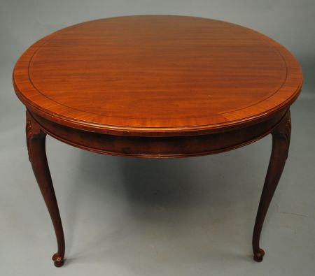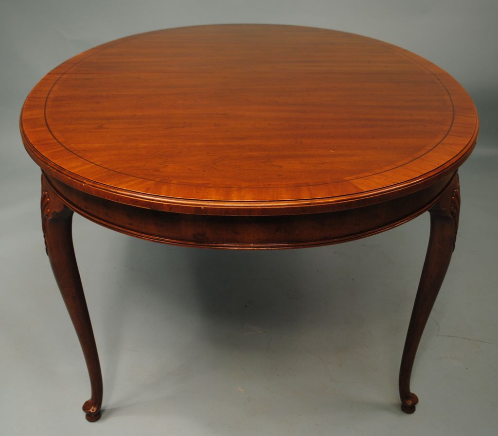 A fine Henredon 18th Century Portfolio Collection mahogany banded & inlaid Queen Anne oval dining table, cabriole legs with shell carved knees terminating in pad feet, 9' x 45"w including two 20" leaves, late 20th century. (Matches Lot #497A below) A fine Henredon 18th Century Portfolio Collection mahogany banded & inlaid Queen Anne oval dining table, cabriole legs with shell carved knees terminating in pad feet, 9' x 45"w including two 20" leaves, late 20th century. (Matches Lot #497A below)