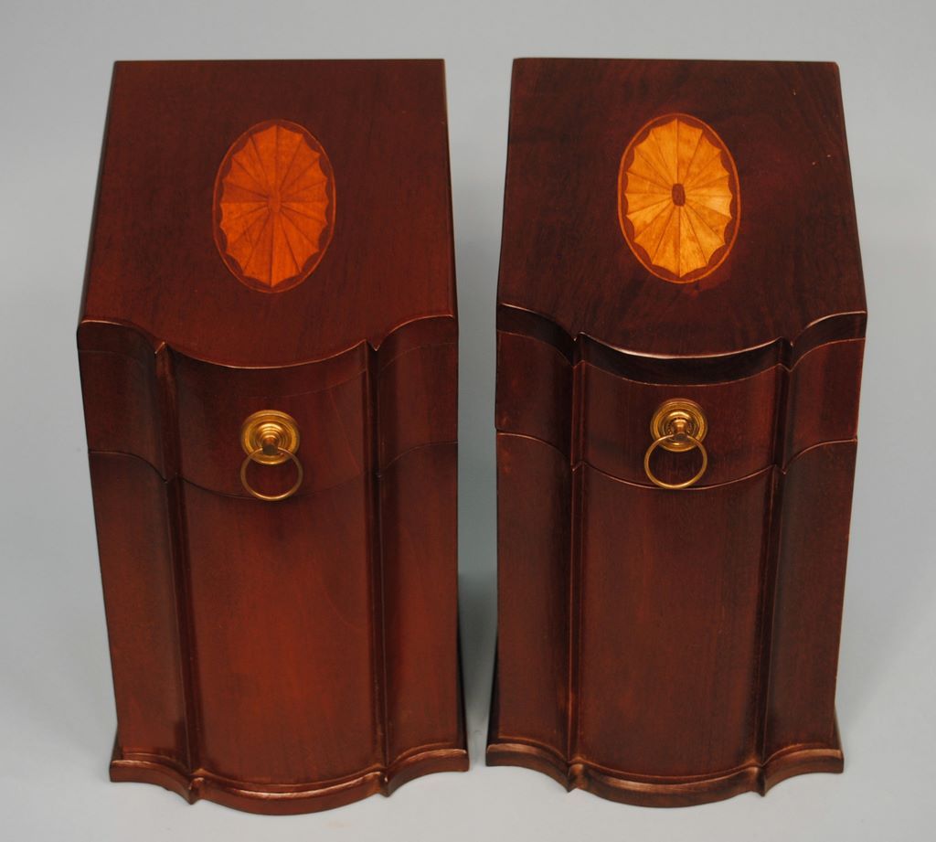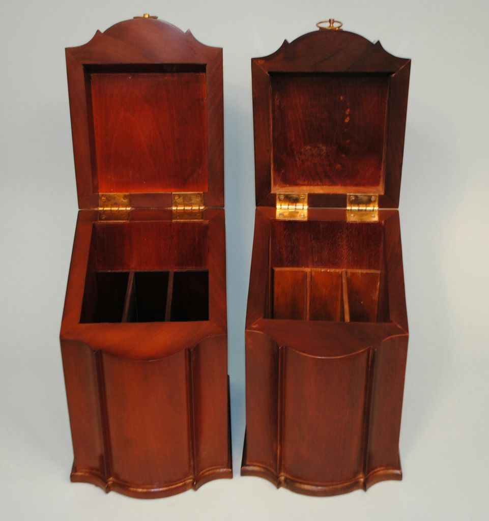 A matched pair of Georgian mahogany knife boxes, 20th century, serpentine form, the slanted lids with decorative satinwood inlay, each 13 1/8"h x 7"w x 8 1/2"d. Interiors of both are divided into three storage slots. A matched pair of Georgian mahogany knife boxes, 20th century, serpentine form, the slanted lids with decorative satinwood inlay, each 13 1/8"h x 7"w x 8 1/2"d. Interiors of both are divided into three storage slots.