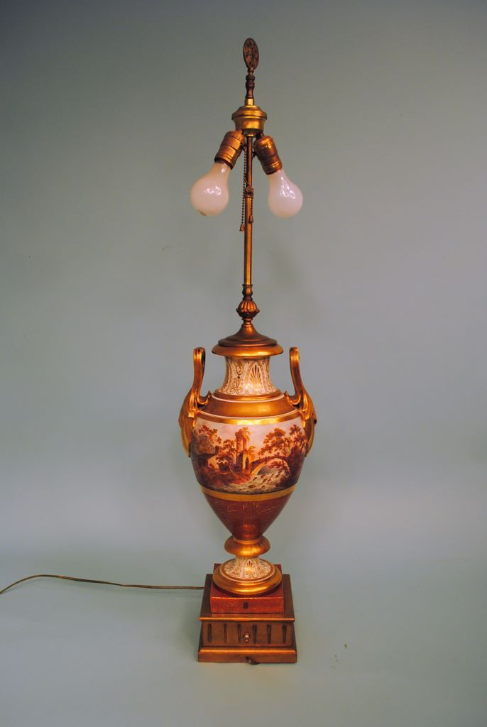 Old Paris Porcelain Two-Handled Urn, mid 19th century, with hand painted polychrome historical scene, now electrified and mounted as a table lamp, H. 18"; drilled and cut at the base. Old Paris Porcelain Two-Handled Urn, mid 19th century, with hand painted polychrome historical scene, now electrified and mounted as a table lamp, H. 18"; drilled and cut at the base.