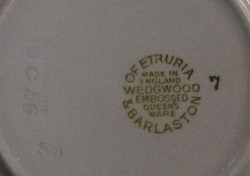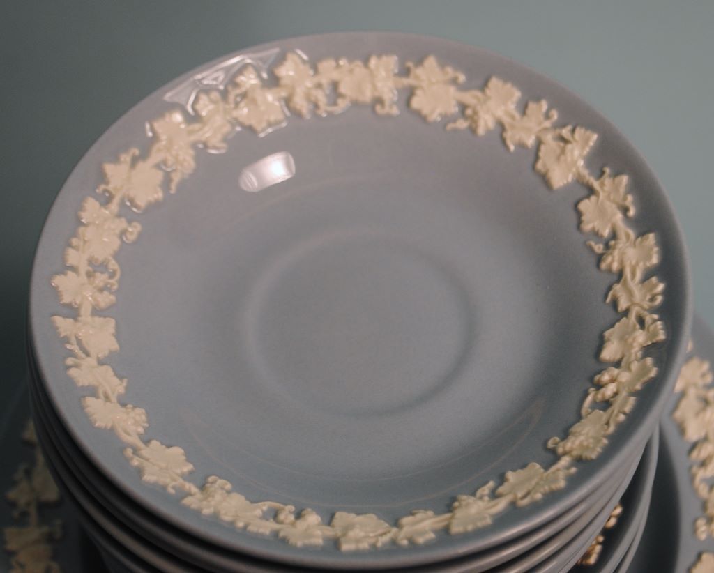 Wedgwood China Set, Blue Embossed "Queensware", set includes 58 pcs; 7 Dinner Plates, 10 1/2" dia. (1 cracked), 3 Plates, 10" dia., 12 Salad Plates, 8" dia., 12 Bread and Butter, 6" dia., 12 Saucers, 4" dia., 12 cups Wedgwood China Set, Blue Embossed "Queensware", set includes 58 pcs; 7 Dinner Plates, 10 1/2" dia. (1 cracked), 3 Plates, 10" dia., 12 Salad Plates, 8" dia., 12 Bread and Butter, 6" dia., 12 Saucers, 4" dia., 12 cups