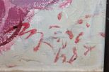 A mid-century modern semi-abstract painting of Balinese dancers, indecipherable signature lower right. Canvas 27" x 27", in 36" x 36" wooden frame. A mid-century modern semi-abstract painting of Balinese dancers, indecipherable signature lower right. Canvas 27" x 27", in 36" x 36" wooden frame.