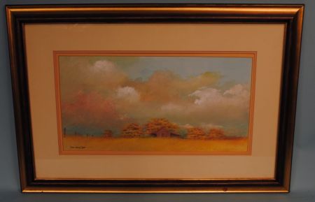 Carole Hardy Pigott, American, Watercolor of Abandoned Farmhouse, from her Eudora Welty series of paintings inspired by Ms. Welty's work, this watercolor inspired by "Delta Wedding." The watercolor comes with original framed calligraphy, a quote from Delta Wedding: "It was a soft day brimming with the light of afternoon. It was the fifth beautiful week, with only that one threatening day. The gold mass of the distant shade trees seemed to advance, to sway, under the plum-colored sky. Signed lower left, 22"h x 32" in natural wood and gold leaf frame. Carole Hardy Pigott, American, Watercolor of Abandoned Farmhouse, from her Eudora Welty series of paintings inspired by Ms. Welty's work, this watercolor inspired by "Delta Wedding." The watercolor comes with original framed calligraphy, a quote from Delta Wedding: "It was a soft day brimming with the light of afternoon. It was the fifth beautiful week, with only that one threatening day. The gold mass of the distant shade trees seemed to advance, to sway, under the plum-colored sky. Signed lower left, 22"h x 32" in natural wood and gold leaf frame.