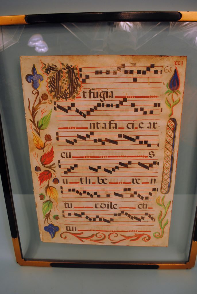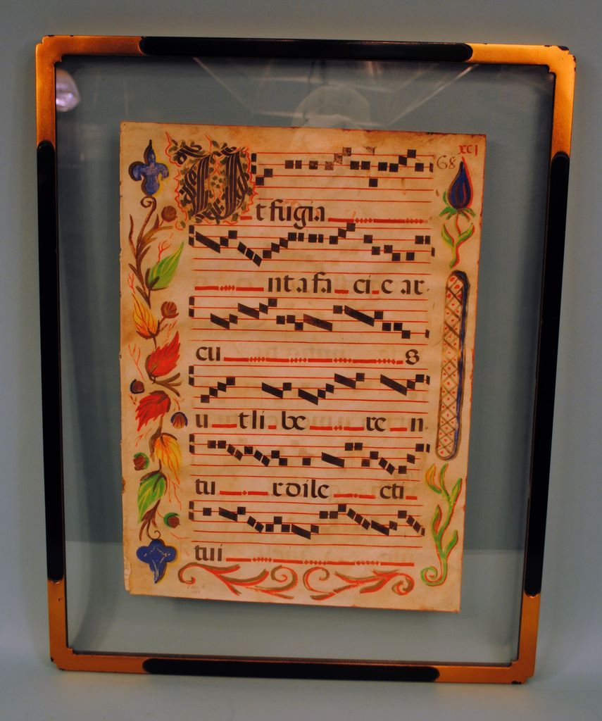 An early illuminated vellum manuscript music page, page 21"h x 15 3/8", 29"h x 22 1/2" in front & back glassed frame. An early illuminated vellum manuscript music page, page 21"h x 15 3/8", 29"h x 22 1/2" in front & back glassed frame.