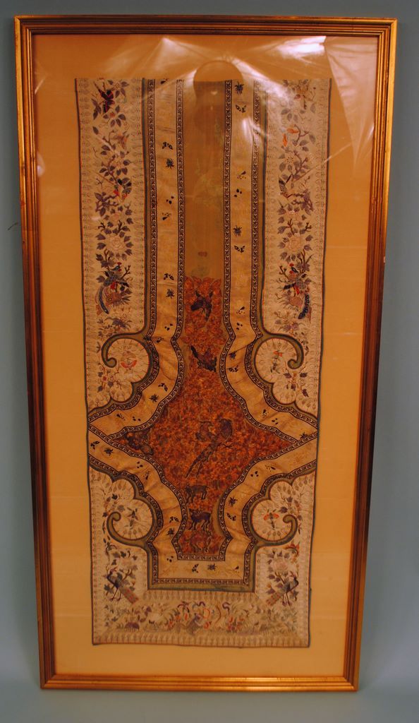 A very fine Chinese c1860 Intricate Gold Embroidered Chinese framed back of silk Robe, 24k threads, with incredibly intricate designs of cranes, foo dogs, moths, birds, deer and butterflies. A large portion of the center is embroidered in gold thread. 38 1/2"h x 19 1/2" in simple gold-leaf frame. A very fine Chinese c1860 Intricate Gold Embroidered Chinese framed back of silk Robe, 24k threads, with incredibly intricate designs of cranes, foo dogs, moths, birds, deer and butterflies. A large portion of the center is embroidered in gold thread. 38 1/2"h x 19 1/2" in simple gold-leaf frame.
