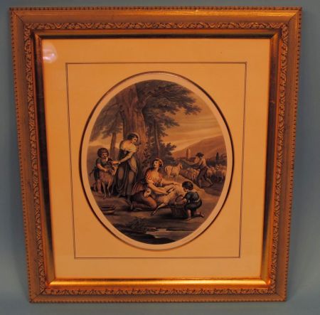 565 Oval Hand Colored Engraving of Sheep, Children, Ladies And Herder In Modern Gold Frame