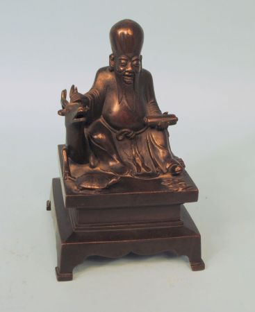 A fine Meiji bronze of Fukurokuju, the Immortal of wealth, happiness and longevity, holding a scroll in one hand, his other hand on a deer. A tortoise sits to his right, and a crane once stood to his left, now missing. 7 1/2"h x 4 1/2" x 4 1/2". A fine Meiji bronze of Fukurokuju, the Immortal of wealth, happiness and longevity, holding a scroll in one hand, his other hand on a deer. A tortoise sits to his right, and a crane once stood to his left, now missing. 7 1/2"h x 4 1/2" x 4 1/2".