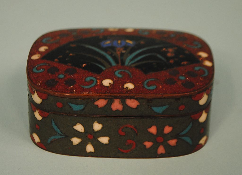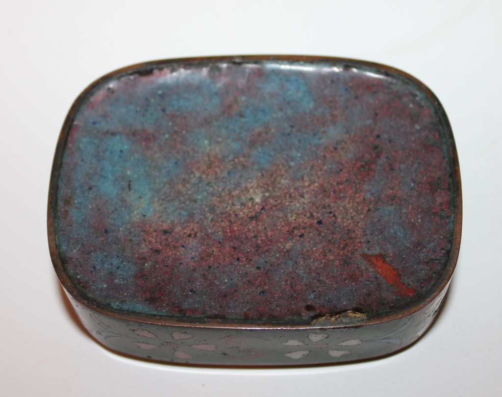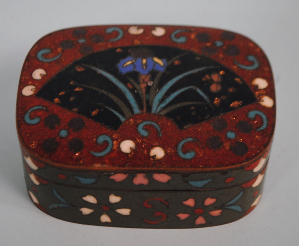Late 19th century Japanese goldstone cloisonne trinket box, 1 1/2"h x 3 1/2"w x 2 1/2"d, decorated with an iris and fan. Late 19th century Japanese goldstone cloisonne trinket box, 1 1/2"h x 3 1/2"w x 2 1/2"d, decorated with an iris and fan.