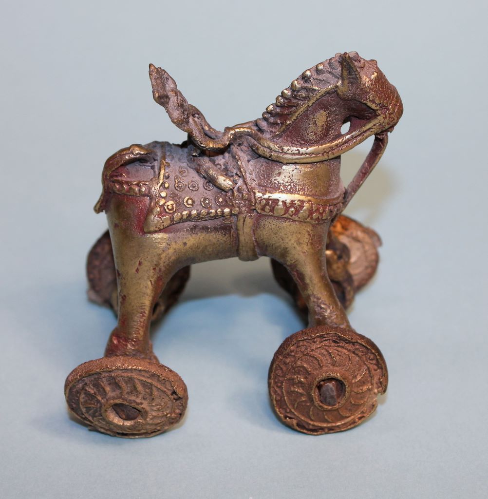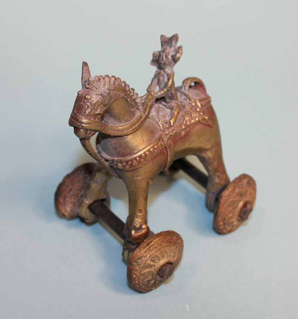 An early brass Indian God on a wheeled horse Temple Toy, 3" x 3 1/2" x 4"h, one of the horse's ear is missing. An early brass Indian God on a wheeled horse Temple Toy, 3" x 3 1/2" x 4"h, one of the horse's ear is missing.