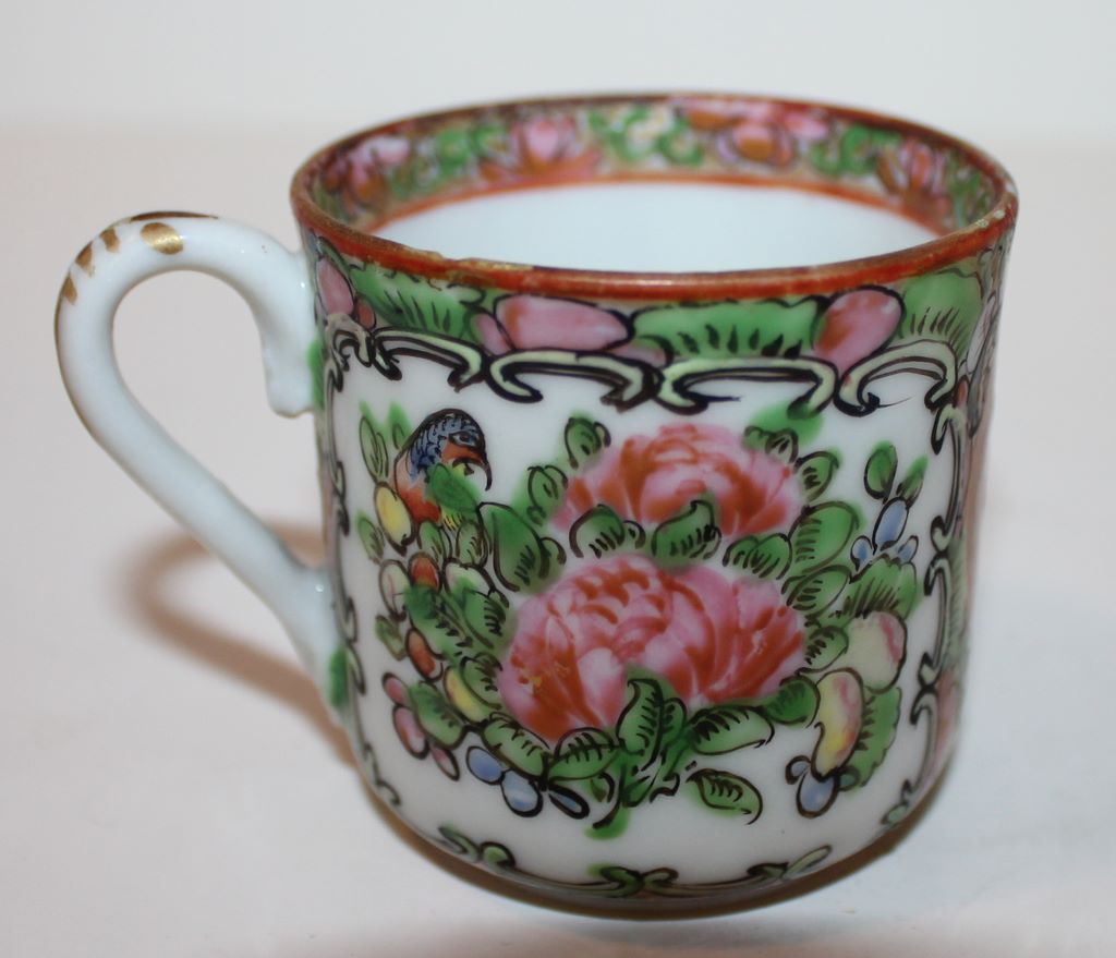 A collection of 22 pieces of "Rose Medallion" Chinese Export Porcelain, 19th to early 20th Century, including three 7 1/4" plates (no mark), a sugar bowl (no lid, no mark), a rice bowl ("China" mark), five demitasse cups (no mark, speck nick to one rim), five teacups (4 unmarked, one "China"), and seven assorted saucer plates (all with rim nicks or chips). A collection of 22 pieces of "Rose Medallion" Chinese Export Porcelain, 19th to early 20th Century, including three 7 1/4" plates (no mark), a sugar bowl (no lid, no mark), a rice bowl ("China" mark), five demitasse cups (no mark, speck nick to one rim), five teacups (4 unmarked, one "China"), and seven assorted saucer plates (all with rim nicks or chips).