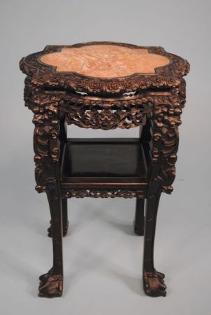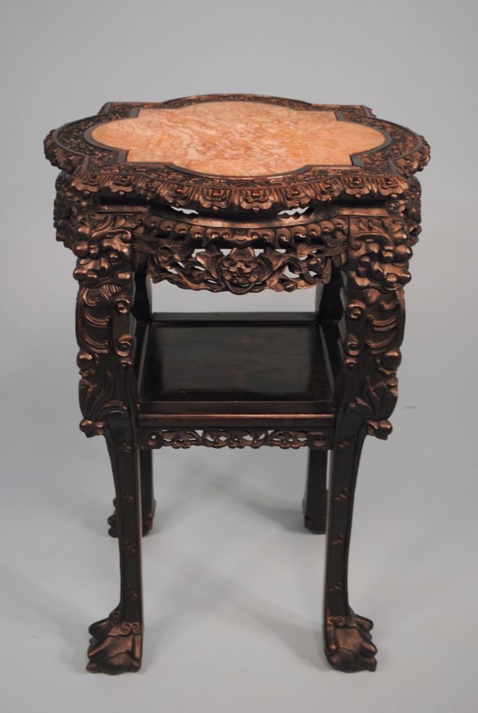 19th Century Elaborately Carved Chinese Teakwood Stand; stand has inset marble, elaborate carving on each side leading to a shelf which is all supported by claw feet, 22" H., 21" dia. 19th Century Elaborately Carved Chinese Teakwood Stand; stand has inset marble, elaborate carving on each side leading to a shelf which is all supported by claw feet, 22" H., 21" dia.