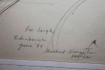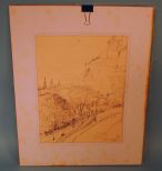 Mildred Nungester Wolfe (1912-2009), Jackson, Mississippi, original pen and ink sketch of an Edinburgh, Scotland landscape, 12" x 16", in a 16" x 20" soiled matt. Fully signed lower right and Inscribed "for Leigh, Edinburgh, June 1984." Likely a study for item # 71, Edinburgh painting above. Collection of Leigh Barrett Latimer Mildred Nungester Wolfe (1912-2009), Jackson, Mississippi, original pen and ink sketch of an Edinburgh, Scotland landscape, 12" x 16", in a 16" x 20" soiled matt. Fully signed lower right and Inscribed "for Leigh, Edinburgh, June 1984." Likely a study for item # 71, Edinburgh painting above. Collection of Leigh Barrett Latimer