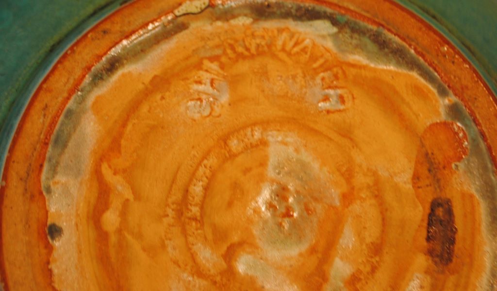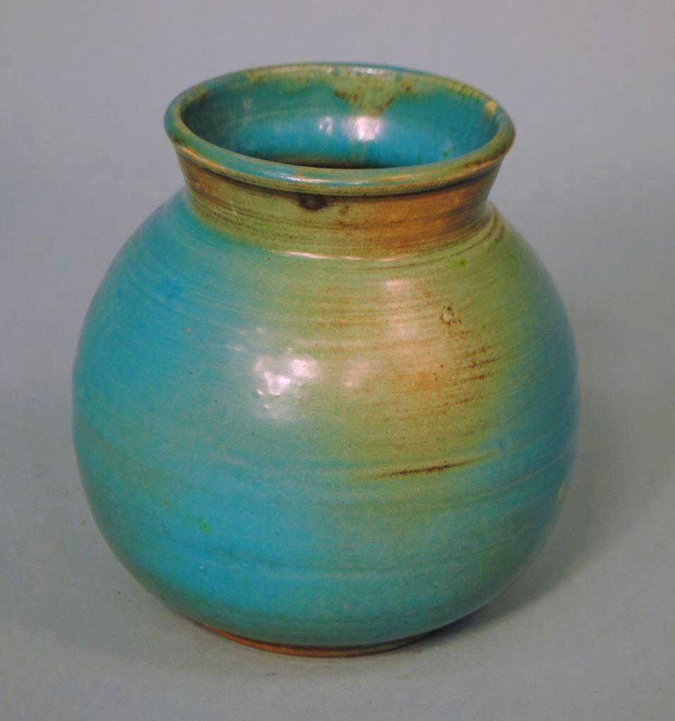 A 1940s Shearwater Pottery 5 3/8"h vase by Peter Anderson (1901-1984), doubled glazed in alkaline blue over mossy green. A 1940s Shearwater Pottery 5 3/8"h vase by Peter Anderson (1901-1984), doubled glazed in alkaline blue over mossy green.