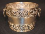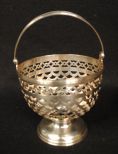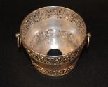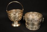 A Tiffany & Company 3 1/2" diameter x 5 1/4"h handled basket with pierced design, may have originally had a glass liner; and a very fine dated 1880 Gorham two handled pierced basket or wine caster, 2 3/4"h x 3 1/2" diameter. A Tiffany & Company 3 1/2" diameter x 5 1/4"h handled basket with pierced design, may have originally had a glass liner; and a very fine dated 1880 Gorham two handled pierced basket or wine caster, 2 3/4"h x 3 1/2" diameter.