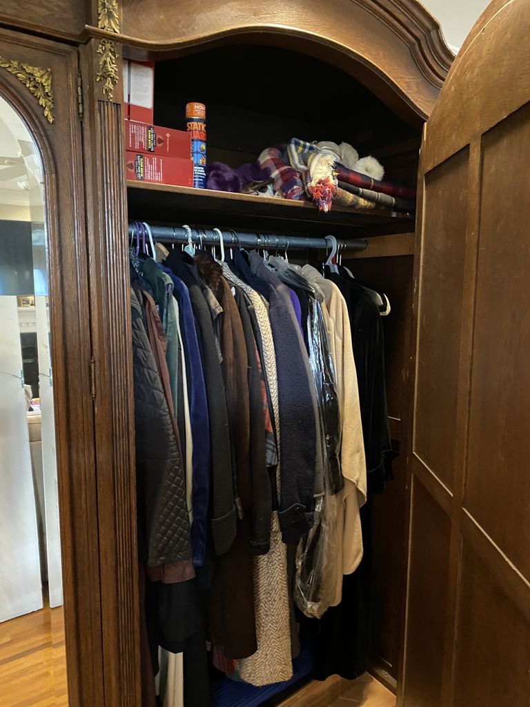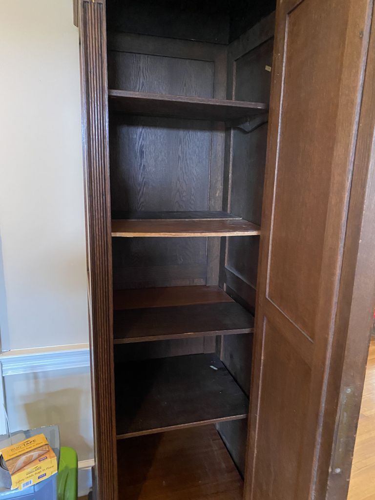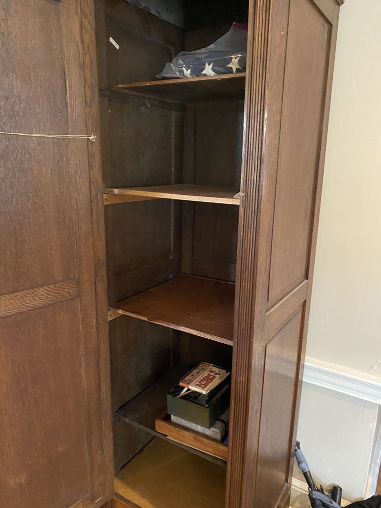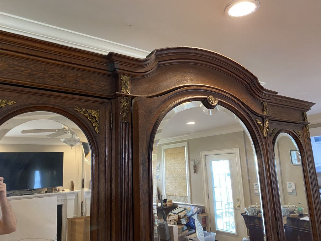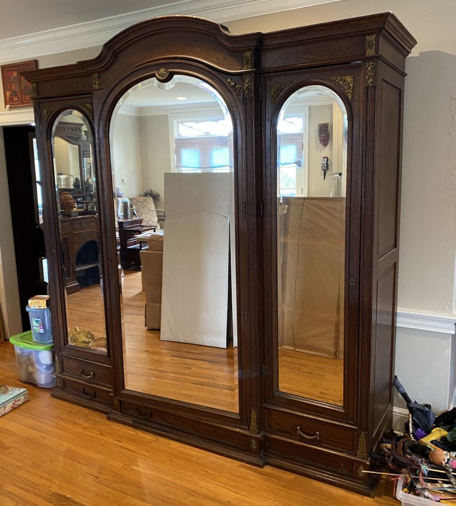 Large Antique French Style Oak Three Door Wardrobe, three beveled mirrored doors, side door with interior shelving, center door with shelves and clothes hanging, piece will break down, missing side base trim on right side, very good condition, 94"h., 89"w., 24"d. Location Living Room 2 Large Antique French Style Oak Three Door Wardrobe, three beveled mirrored doors, side door with interior shelving, center door with shelves and clothes hanging, piece will break down, missing side base trim on right side, very good condition, 94"h., 89"w., 24"d. Location Living Room 2