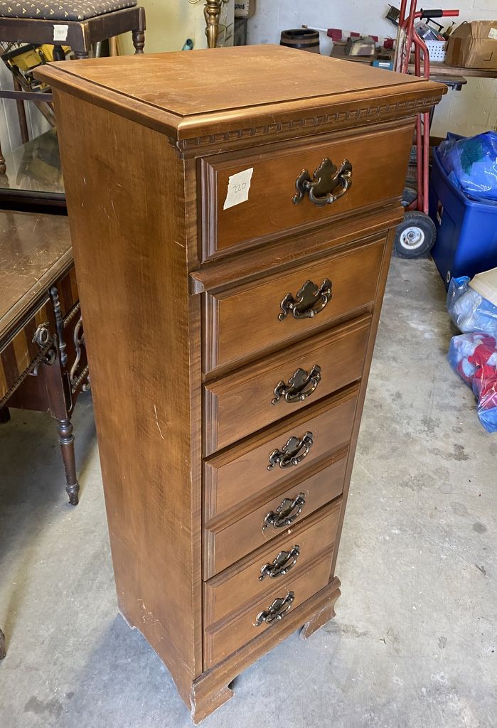 Late 20th Century Cherry Lingerie Chest, traditional style, has scratches and wear, 50"H., 19"w. Location Garage Late 20th Century Cherry Lingerie Chest, traditional style, has scratches and wear, 50"H., 19"w. Location Garage