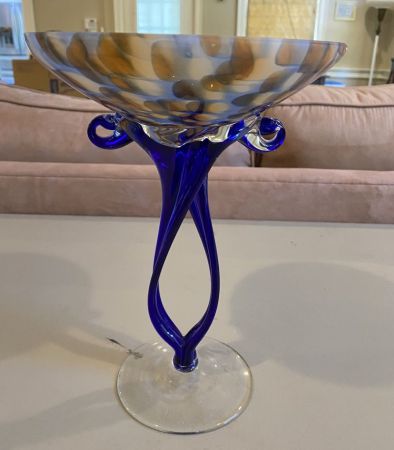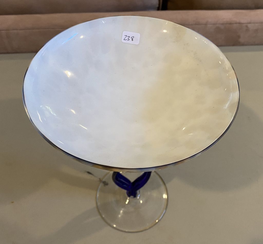 Polish Art Glass Compote, hand blown, crafted, cobalt blue stem with white top, 10"h,. Location Living Room 2 Polish Art Glass Compote, hand blown, crafted, cobalt blue stem with white top, 10"h,. Location Living Room 2