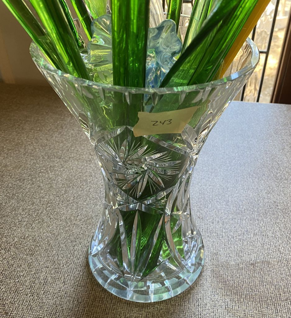 243 Etched Hobstar Crystal Vase with Glass Flower Arrangement