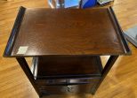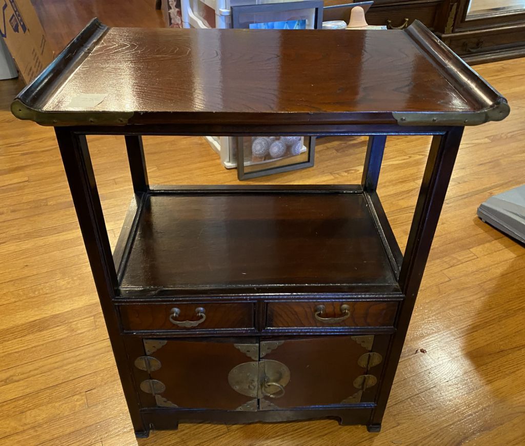 Vintage Korean Elm Wood Side End Table, brass accents, two tier, light wear, 25"h., 20"w. Location Living Room 2 Vintage Korean Elm Wood Side End Table, brass accents, two tier, light wear, 25"h., 20"w. Location Living Room 2