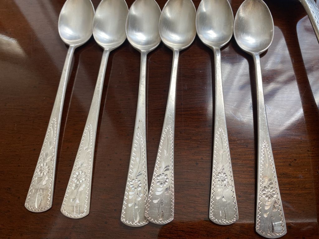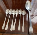 Etched Sterling Demitasse Spoons and Sterling Serving Spoon 9", Location Dining Room, weight is 4.670 ozt Etched Sterling Demitasse Spoons and Sterling Serving Spoon 9", Location Dining Room, weight is 4.670 ozt