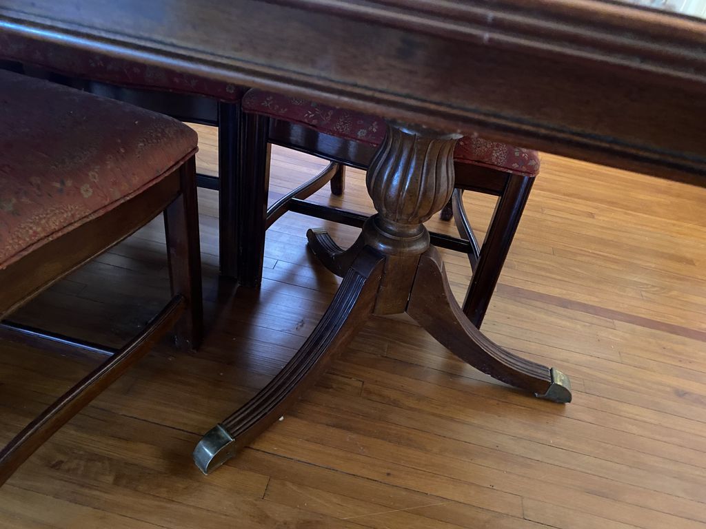 Reproduction Mahogany Banded Dining Table, double pedestal, two leaves, one leaf is scratched, top of table has normal wear with swirls. Location Dining Room Reproduction Mahogany Banded Dining Table, double pedestal, two leaves, one leaf is scratched, top of table has normal wear with swirls. Location Dining Room