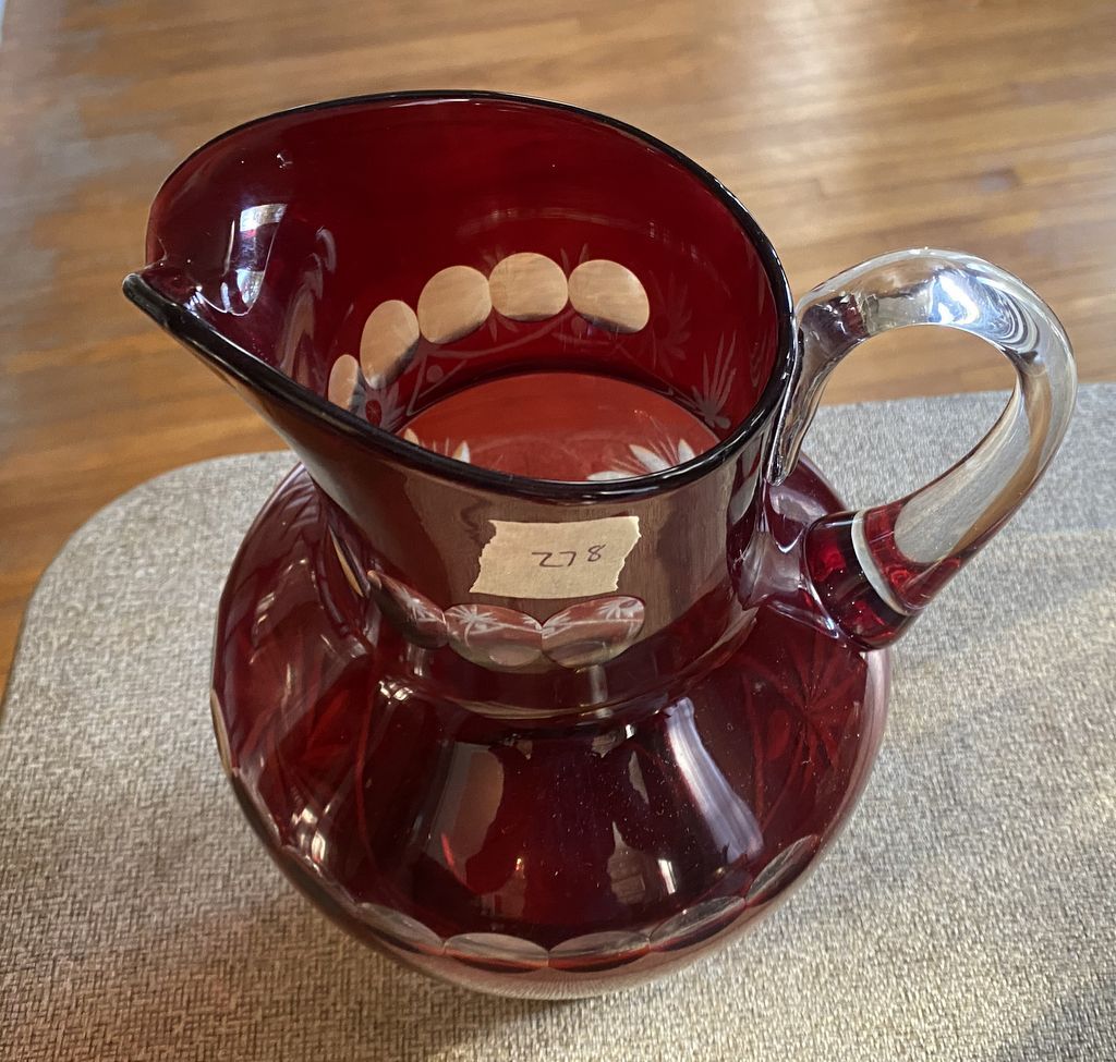 Large Red Cut to Clear Glass Pitcher, 11"h, Location Dining Room Large Red Cut to Clear Glass Pitcher, 11"h, Location Dining Room