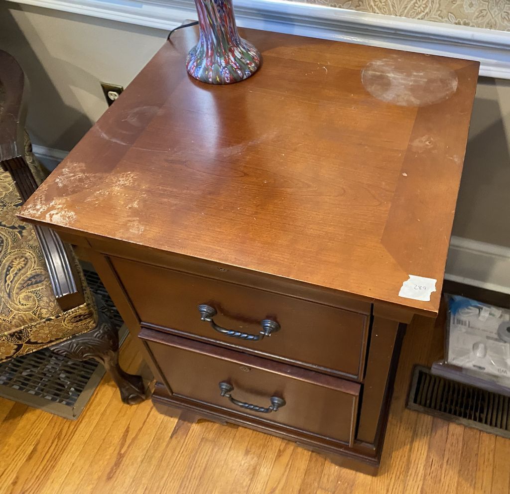 Modern Cherry Two Drawer File Cabinet, finish wear and spots on top, 30"h., 20"w., Location Living Room 2 Modern Cherry Two Drawer File Cabinet, finish wear and spots on top, 30"h., 20"w., Location Living Room 2