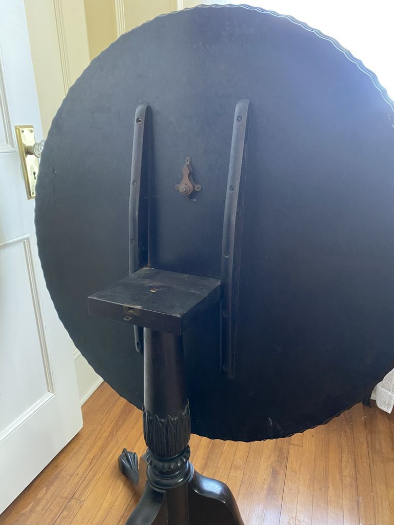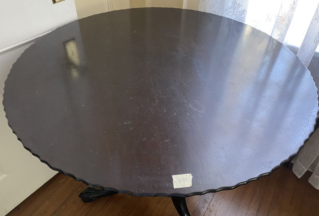 Early 20th Century Ball-n-Claw Tilt Top Round Table, mahogany, pedestal base, light wear, 28"h., 33"dia, Location Living Room 1 Early 20th Century Ball-n-Claw Tilt Top Round Table, mahogany, pedestal base, light wear, 28"h., 33"dia, Location Living Room 1