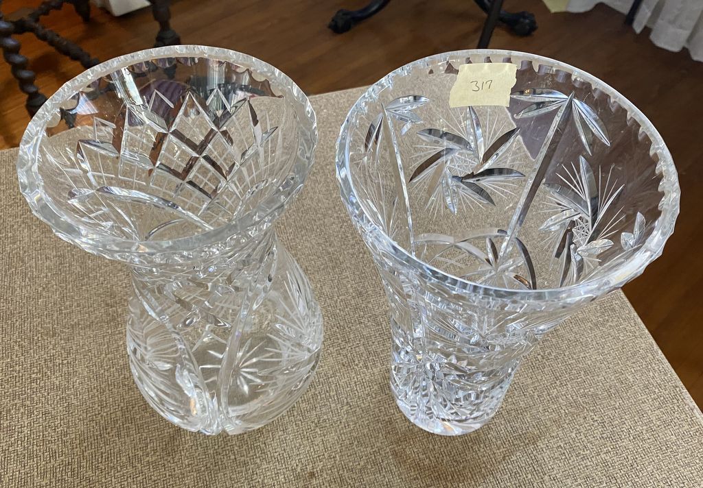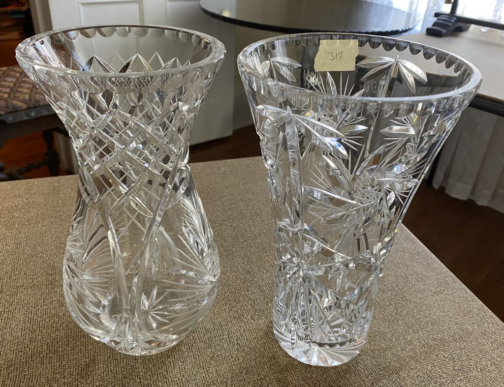 Two Pressed Crystal Flower Vases, etched hobstar, 10 1/2"h, Location Living Room 1 Two Pressed Crystal Flower Vases, etched hobstar, 10 1/2"h, Location Living Room 1