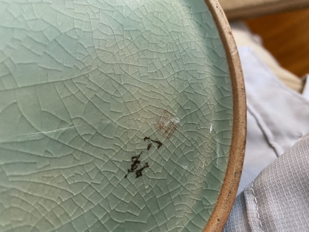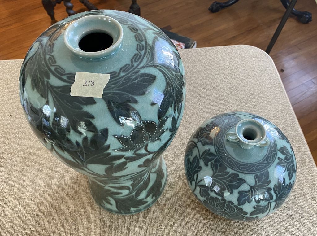 Two Korean Celadon Style Vases, signed, black floral decoration, largest vase is 14"h, porcelain Location Living Room 1 Two Korean Celadon Style Vases, signed, black floral decoration, largest vase is 14"h, porcelain Location Living Room 1