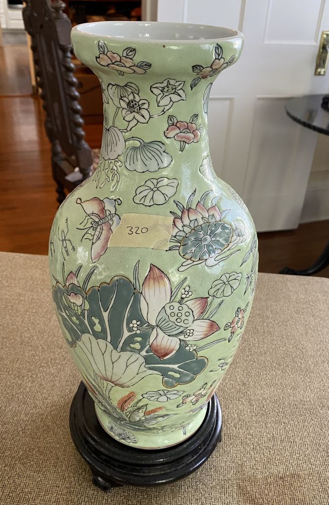 Chinese Modern Porcelain Vase, 14"h, no mark, included wood base, Location Living Room 1 Chinese Modern Porcelain Vase, 14"h, no mark, included wood base, Location Living Room 1