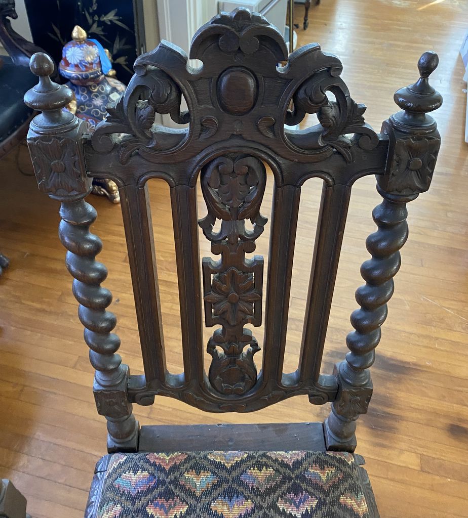 Pair of Antique Hunting Renaissance French Style Oak Chairs, normal age wear, no damage, Location Living Room 1 Pair of Antique Hunting Renaissance French Style Oak Chairs, normal age wear, no damage, Location Living Room 1