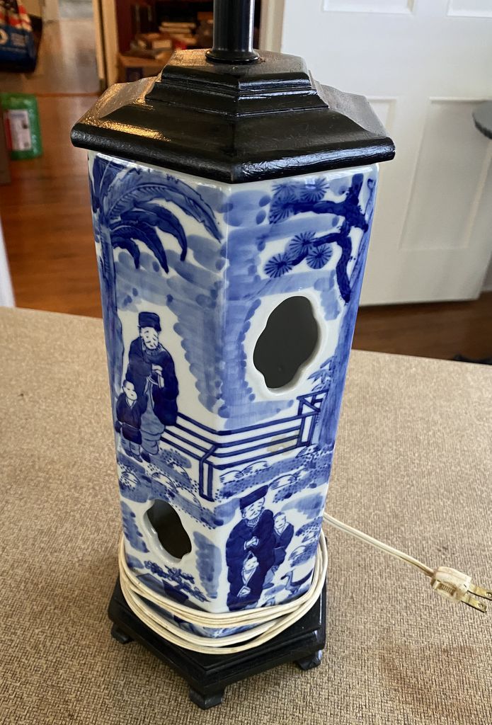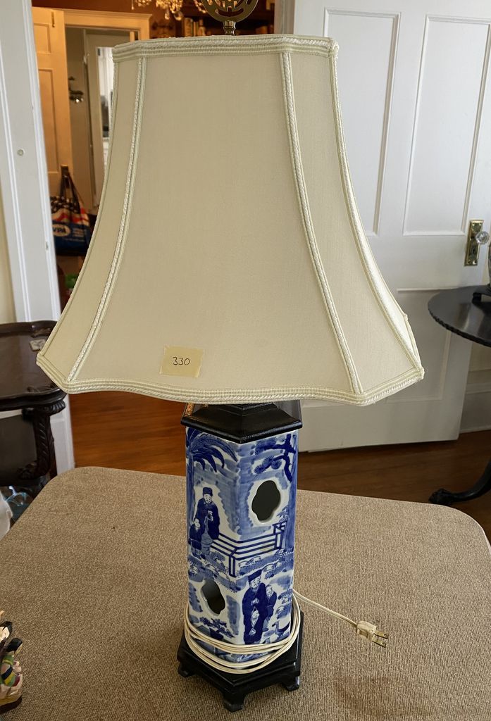 Chinese Blue and White Porcelain Lamp, with shade, 31"h, Location Living Room 1 Chinese Blue and White Porcelain Lamp, with shade, 31"h, Location Living Room 1