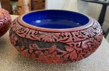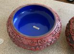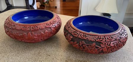 Pair of Chinese Red Cinnabar Pots, enamel interior, early 1900s, good condition, 9"h, Location Living Room 1 Pair of Chinese Red Cinnabar Pots, enamel interior, early 1900s, good condition, 9"h, Location Living Room 1