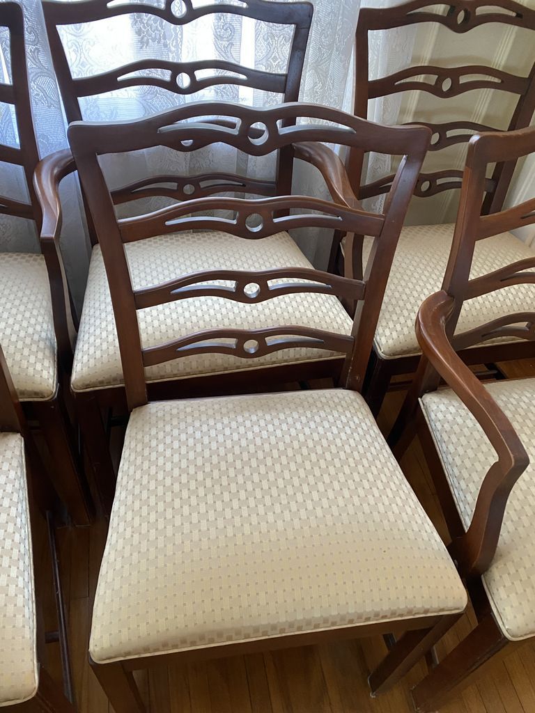 6 Vintage Chippendale Style Ribbon Back Dining Chairs, mahogany, two arms, four sides, has finish wear, Location Living Room 1 6 Vintage Chippendale Style Ribbon Back Dining Chairs, mahogany, two arms, four sides, has finish wear, Location Living Room 1