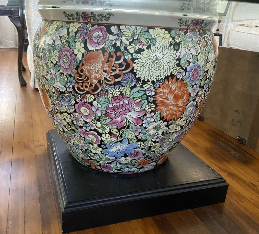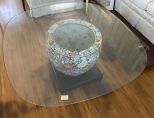 Porcelain Fish Bowl Coffee Table, floral design, glass top, 19"h., 42"w., Location Living Room 1 Porcelain Fish Bowl Coffee Table, floral design, glass top, 19"h., 42"w., Location Living Room 1