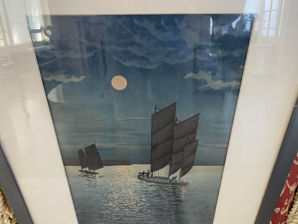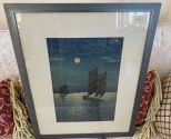 Boats of Shinagawa Night Woodblock Print by Yokoi, matted, framed, 20"h., 14"w, Location Foyer, Location Living Room 1 Boats of Shinagawa Night Woodblock Print by Yokoi, matted, framed, 20"h., 14"w, Location Foyer, Location Living Room 1