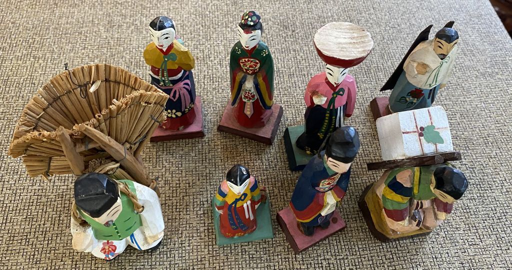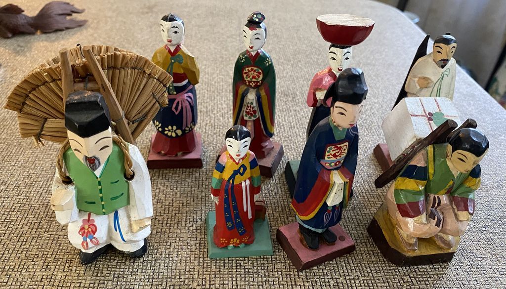 Collection of Traditional Japanese Wooden Carved Figurines, hand crafted, 3 1/2"h, Location Living Room 1 Collection of Traditional Japanese Wooden Carved Figurines, hand crafted, 3 1/2"h, Location Living Room 1