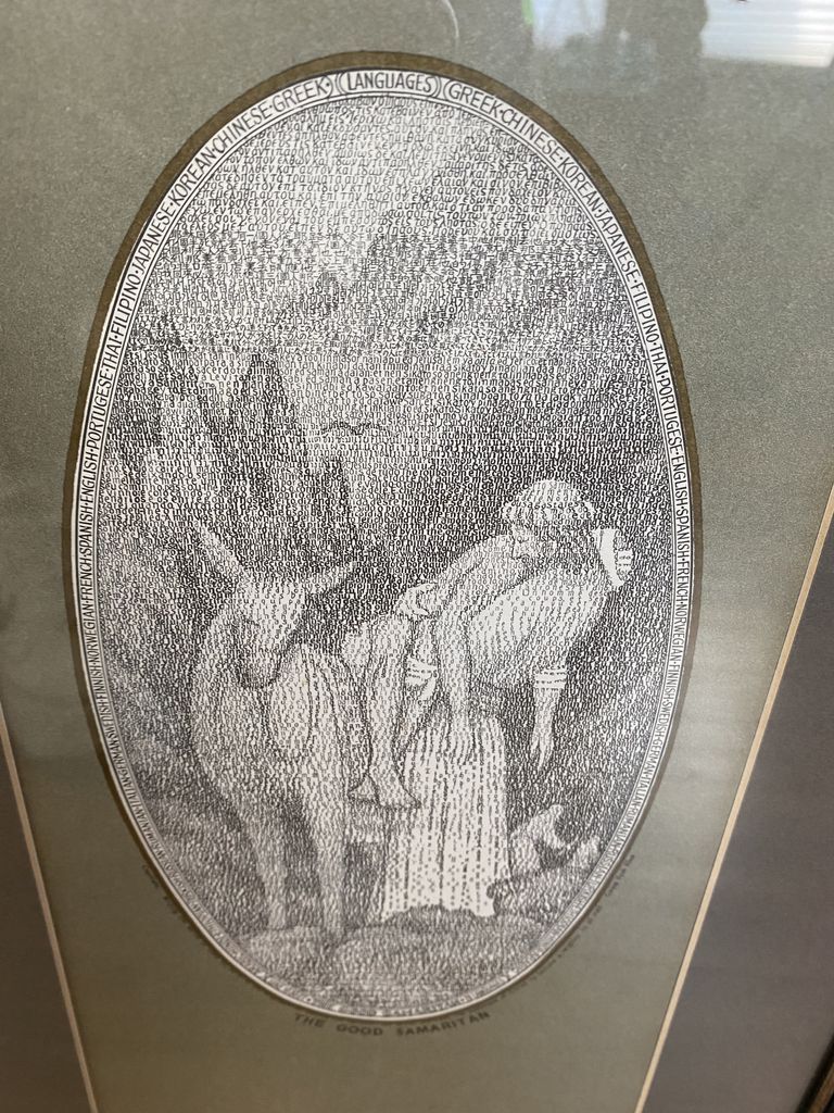 "Good Samaritan" 21 Languages by Gwang Hyuk Rhee, matted, frame is 18"h., 11"w, Location Sunroom "Good Samaritan" 21 Languages by Gwang Hyuk Rhee, matted, frame is 18"h., 11"w, Location Sunroom