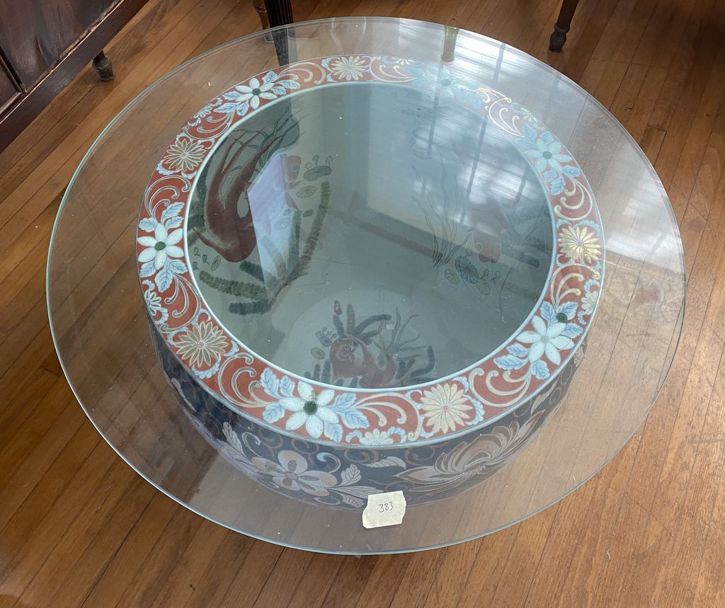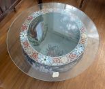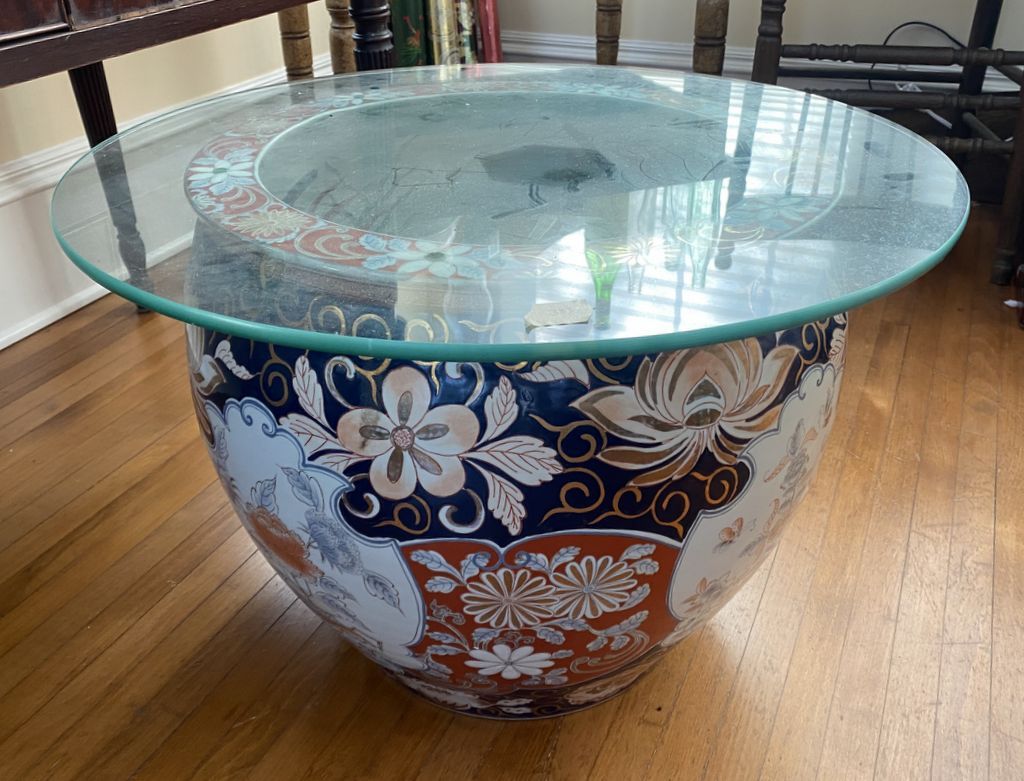 Chinese Porcelain Fish Bowl Planter, round glass top, blue and white floral, 16"h., 24"dia, Location Sunroom Chinese Porcelain Fish Bowl Planter, round glass top, blue and white floral, 16"h., 24"dia, Location Sunroom
