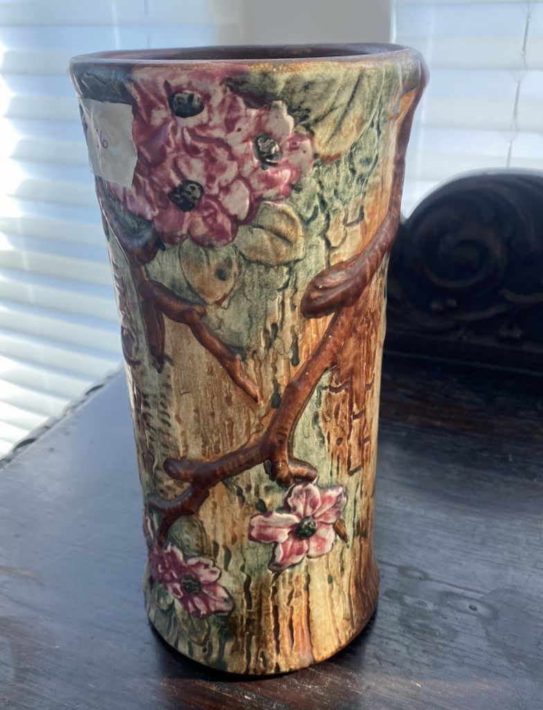 Weller Style Flemish Woodcraft 1920's Art Pottery Vase, 9"h, Location Sunroom Weller Style Flemish Woodcraft 1920's Art Pottery Vase, 9"h, Location Sunroom