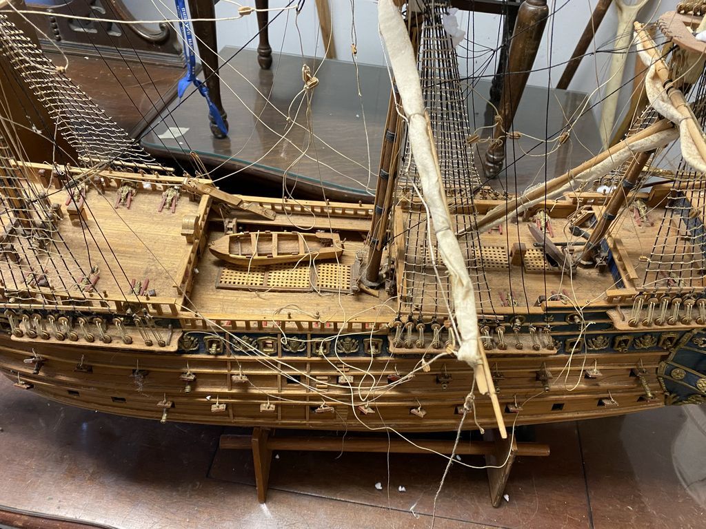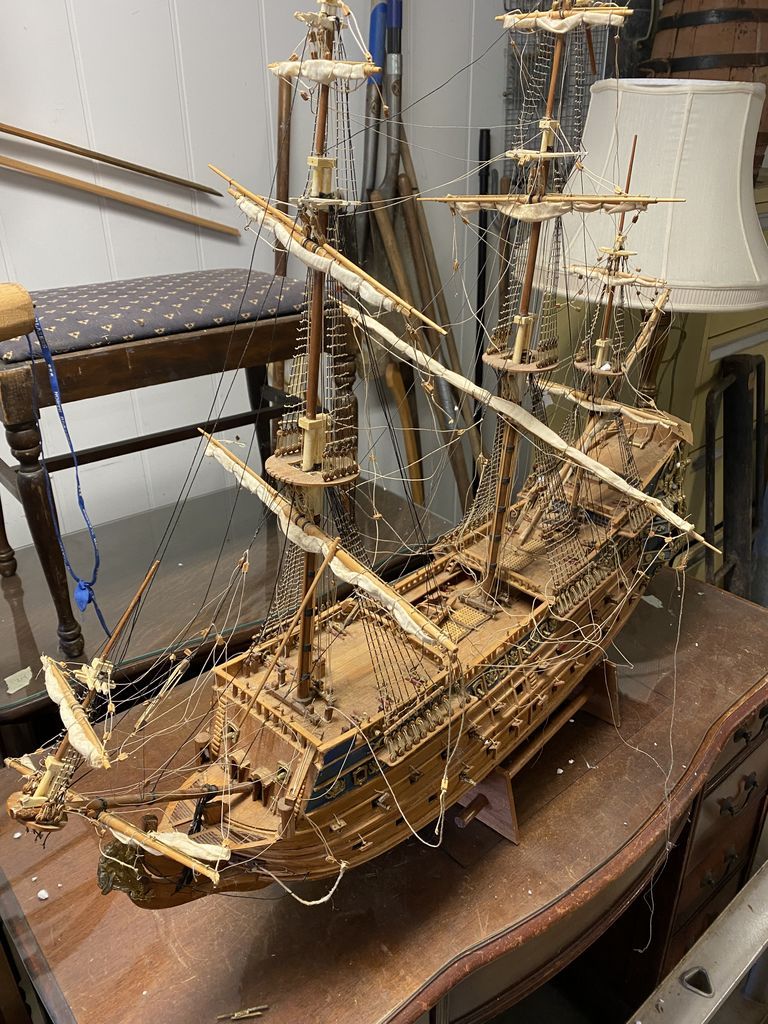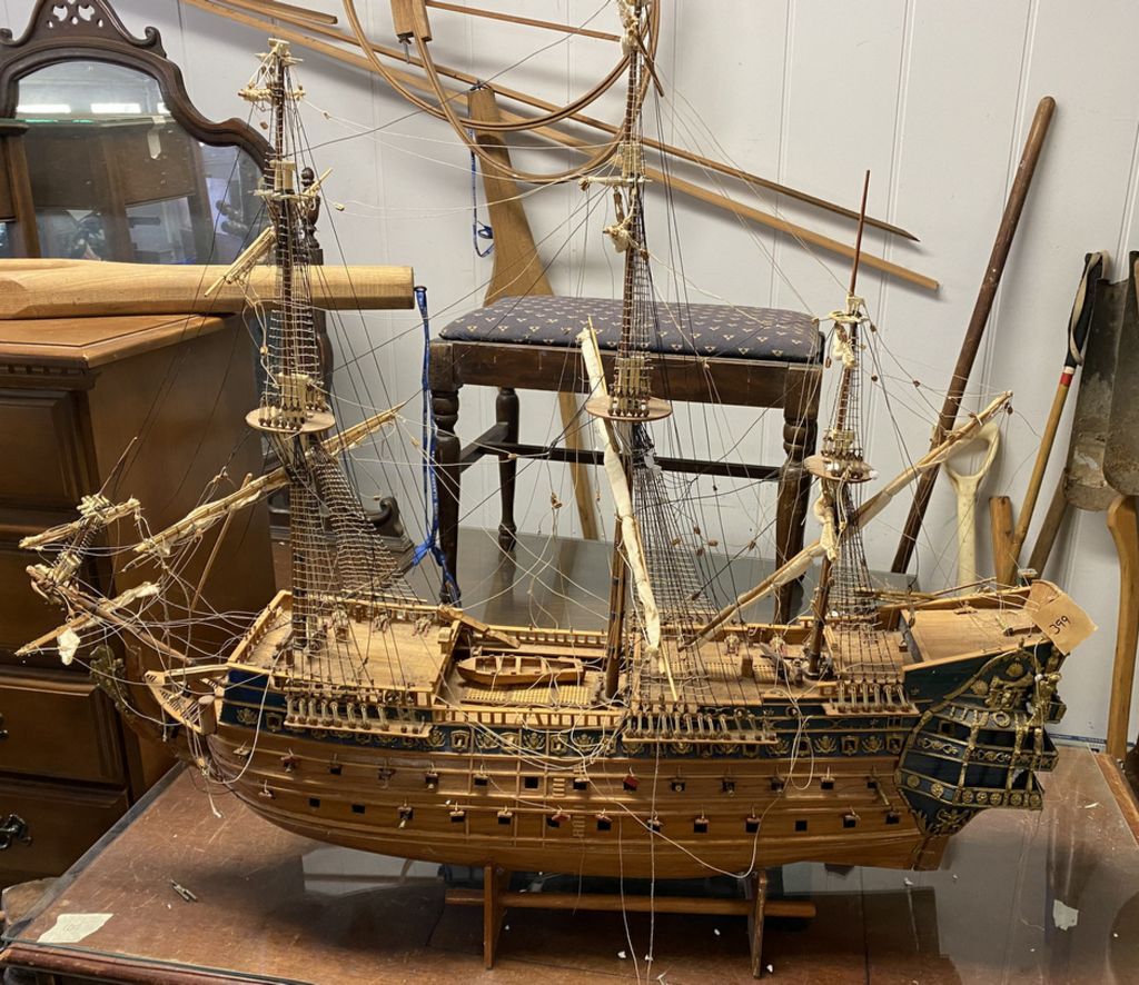 Large Wood Ship Model, will need some repairs on pieces, does include cannons, needs cleaning. Location Garage Large Wood Ship Model, will need some repairs on pieces, does include cannons, needs cleaning. Location Garage