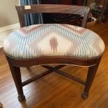 Mid 20th Century Mahogany Vanity Stool, missing veneer, finish wear, 16"h., 24"w, Location Upstairs Bedroom 1 Mid 20th Century Mahogany Vanity Stool, missing veneer, finish wear, 16"h., 24"w, Location Upstairs Bedroom 1